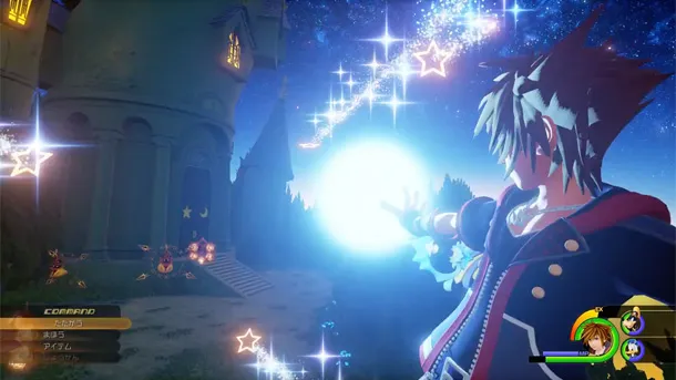 We've seen this attack twice now, both times fighting Lythos. It's worth noting that between its initial reveal and its E3 trailer, the, "Big Magic Mountain," in the bottom left corner disappeared. With the attack, Sora and pals ride a train through the sky swinging the keyblade as he travels.