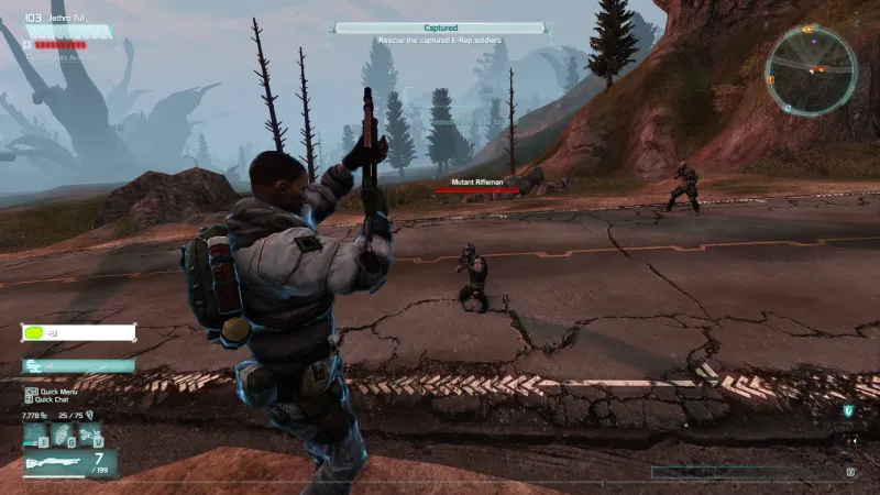 The vaunted tie-in with the SyFy cable TV show is minimal so far. A few characters make cameos with weirdly high-detail but stiffly animated faces, and most of my NPC interaction has been with an alien named Cass. I can only imagine that she serves a cosmic function as a black hole where bad dialogue is sent to not trouble the universe with its hackery any longer, because she is honestly the worst-written caricature of a freelance bounty hunter I have ever encountered – and I have shelves full of Star Wars novels. My intense personal aversion to made-up words doesn't help, with her constant usage of the awful non-word "shtako" as a replacement for the obvious vulgarity. Her reliance on the word is doubly confounding, since plenty of human soldiers have no qualms dropping f-bombs. If I weren't playing Defiance for work purposes, I'd have already mashed the skip dialogue button into pulp.