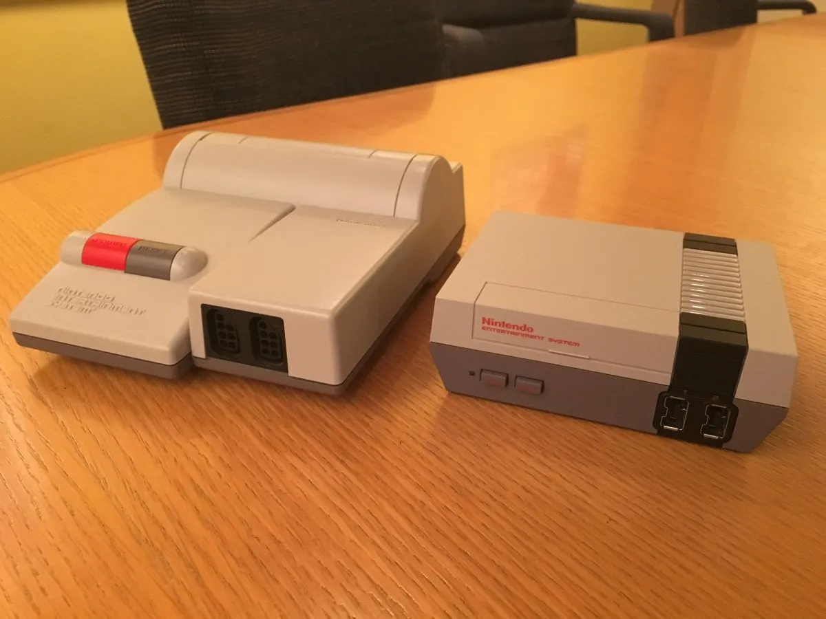 Here's the system placed next to the original NES console, and the redesigned top-loader console.