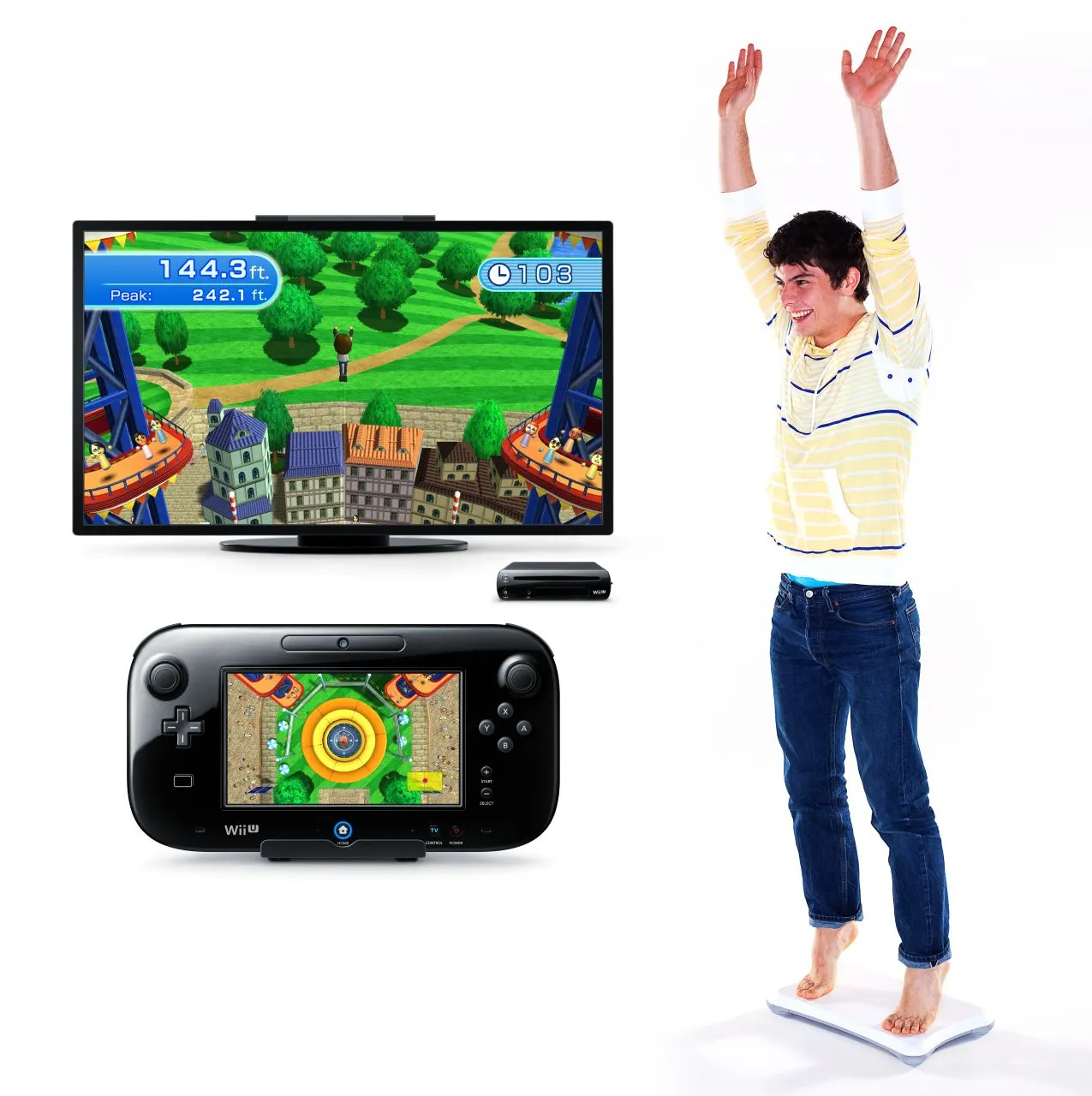 The first game had me jumping on a trampoline with the Wii U tablet controller placed down by my feet. Basically, you make a jump motion with your legs without removing your feet from the board, repeating the motion as your avatar falls back towards the trampoline. The tablet provides the view you would receive by looking down as you plummet. As you fall towards the trampoline you can shift your balance to make sure you land right in the middle. Each consecutive jump throws you higher and higher into the air.