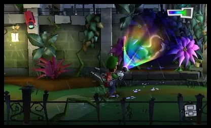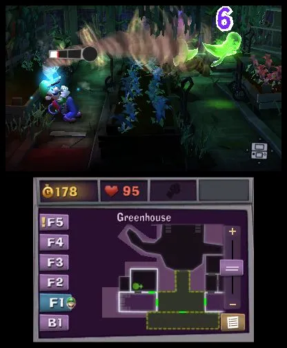 The core of the GameCube title’s gameplay remains the same. Players stun ghosts with a flashlight and use the Poltergust 5000 to suck them up. Dark Moon adds a layer of strategy to the flashlight, allowing players to charge up a wide-radius burst. Backing into a corner with a full charge and blasting a group of hidden ghosts is satisfying, and the subsequent vacuum wrangling still requires players to tug against the ghost like a hooked marlin. Luigi’s vacuum builds up a powerful charge as he wrestles ghosts, which can be triggered to knock big chunks off their health. Players aim the vacuum and flashlight up and down using the face buttons, which may sound clunky but works well in practice. These tweaks to the controls make busting ghosts snappy and rewarding.