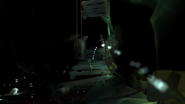 You’re not completely lost in a dark abyss; adorable creatures called Mokos also help you light the world and find your way though it. You can toss these furry friends ahead of you to light a path to your next destination. But while Mokos are friendly, evil apparitions also roam the world, immediately turning the screen red to warn you they’re on the prowl. You’re forced to play the balancing act, because the very sound that gives you a beacon in the world also draws enemies straight to you.