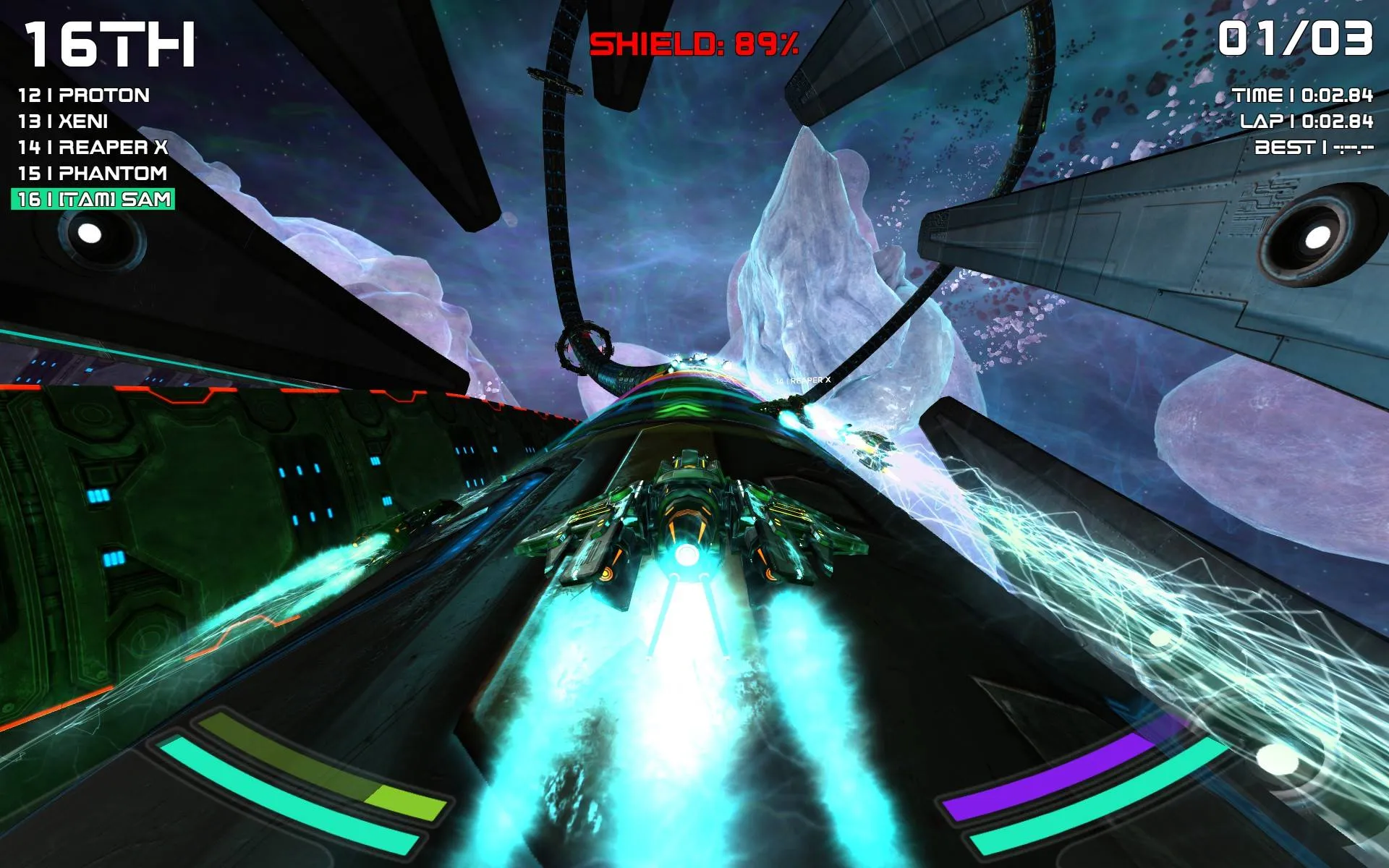 The race types in the career mode don’t add much spice, either. The needless race mode removes the speed-dampening energy fields (why would you remove one of the few track features that adds even a modest wrinkle of complexity?). The eliminator is conventional and uninteresting, and death race is notable only in spite of itself; it doesn’t allow you to repair damage to your ship like in a normal race, but it is hampered by the fact that the other A.I. ships don’t seem to follow the same rules. They bump into you on the track but don’t appear to suffer damage like you do, which is a maddeningly unfair aspect of the mode.