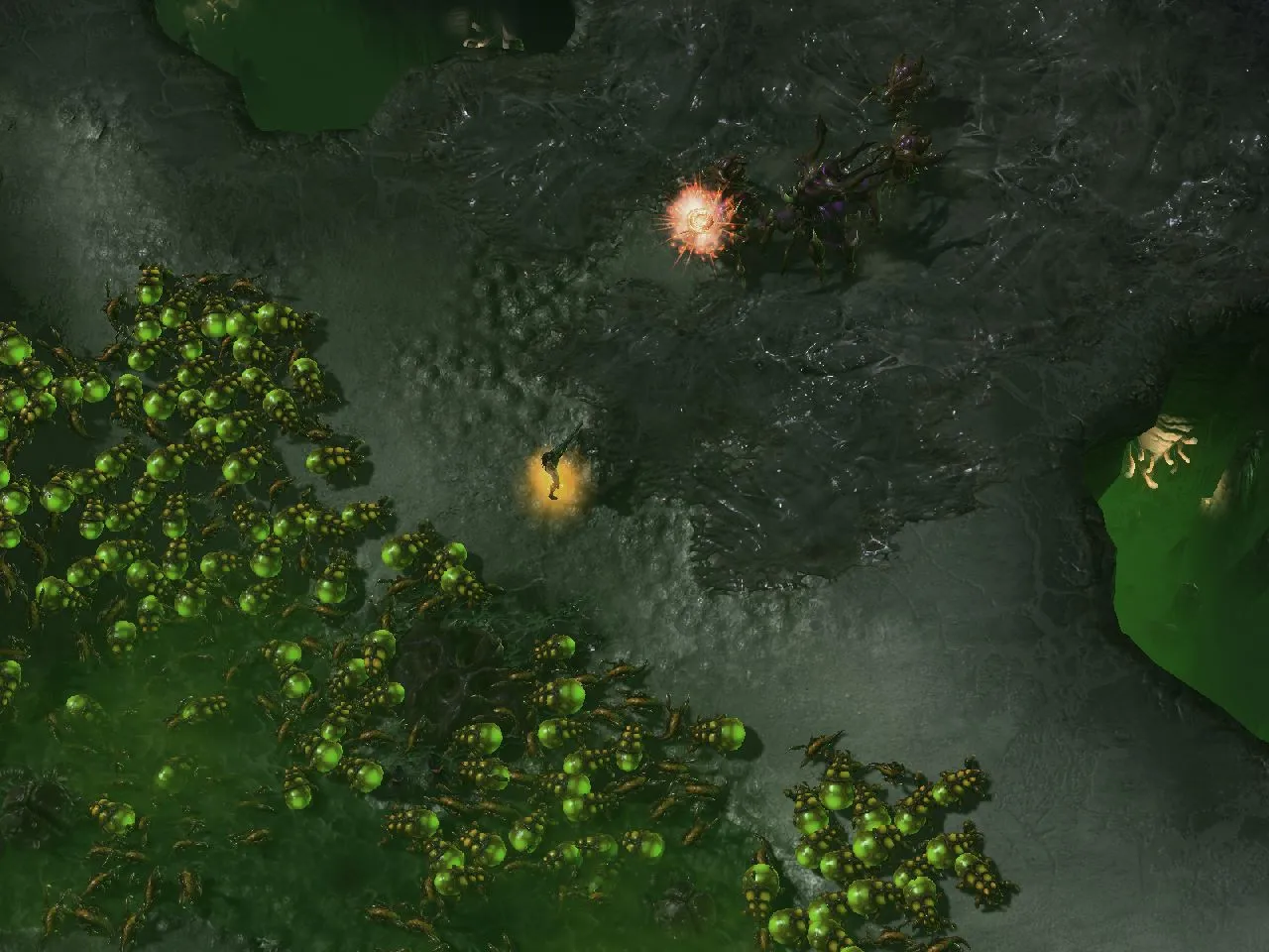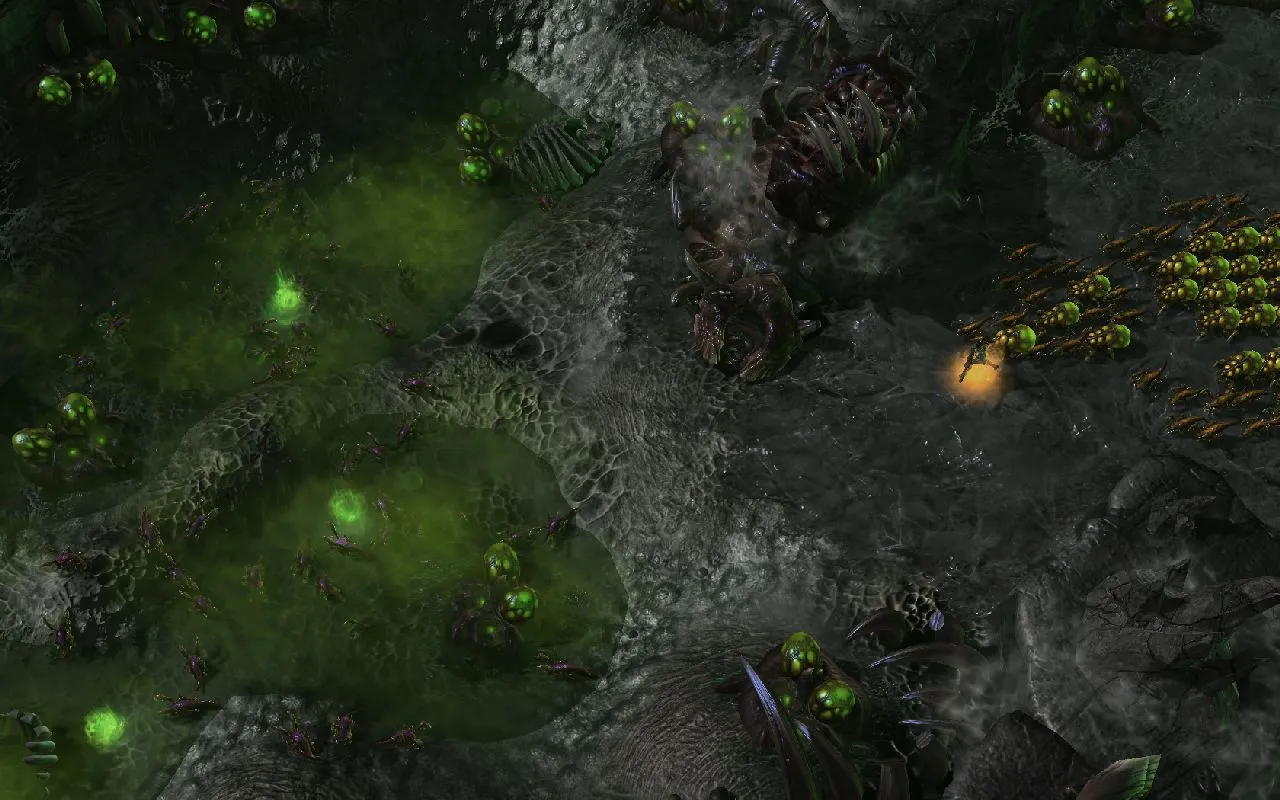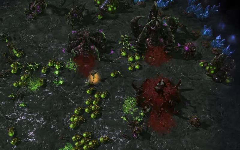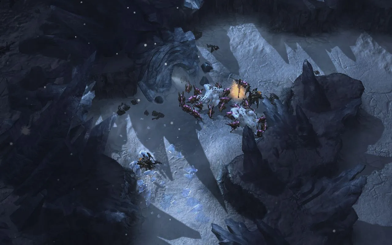 The screens in the media gallery below illustrate the two playable missions from a recent Blizzard press event. You can see the frozen winds of the Kaldir moon freezing Protoss and Zerg alike, and the battles for a cache of baneling eggs in the acid pools of Char.