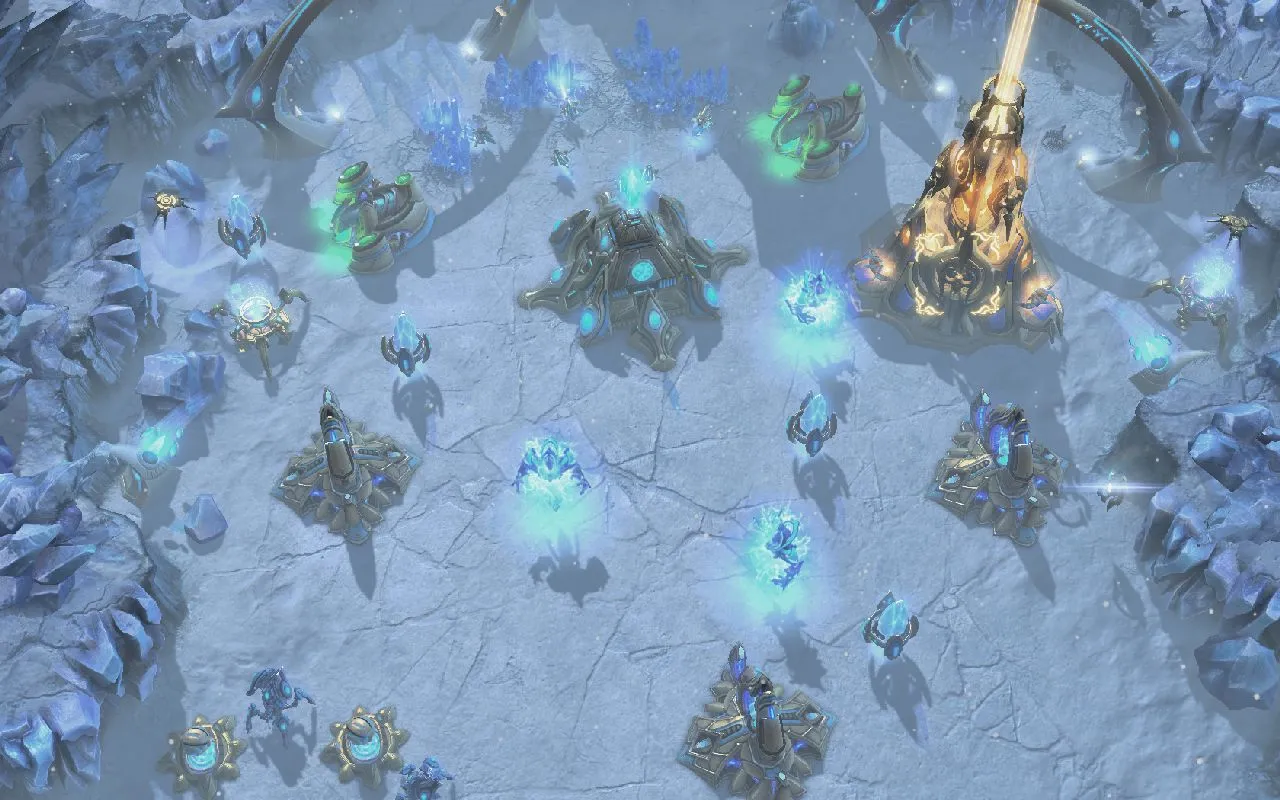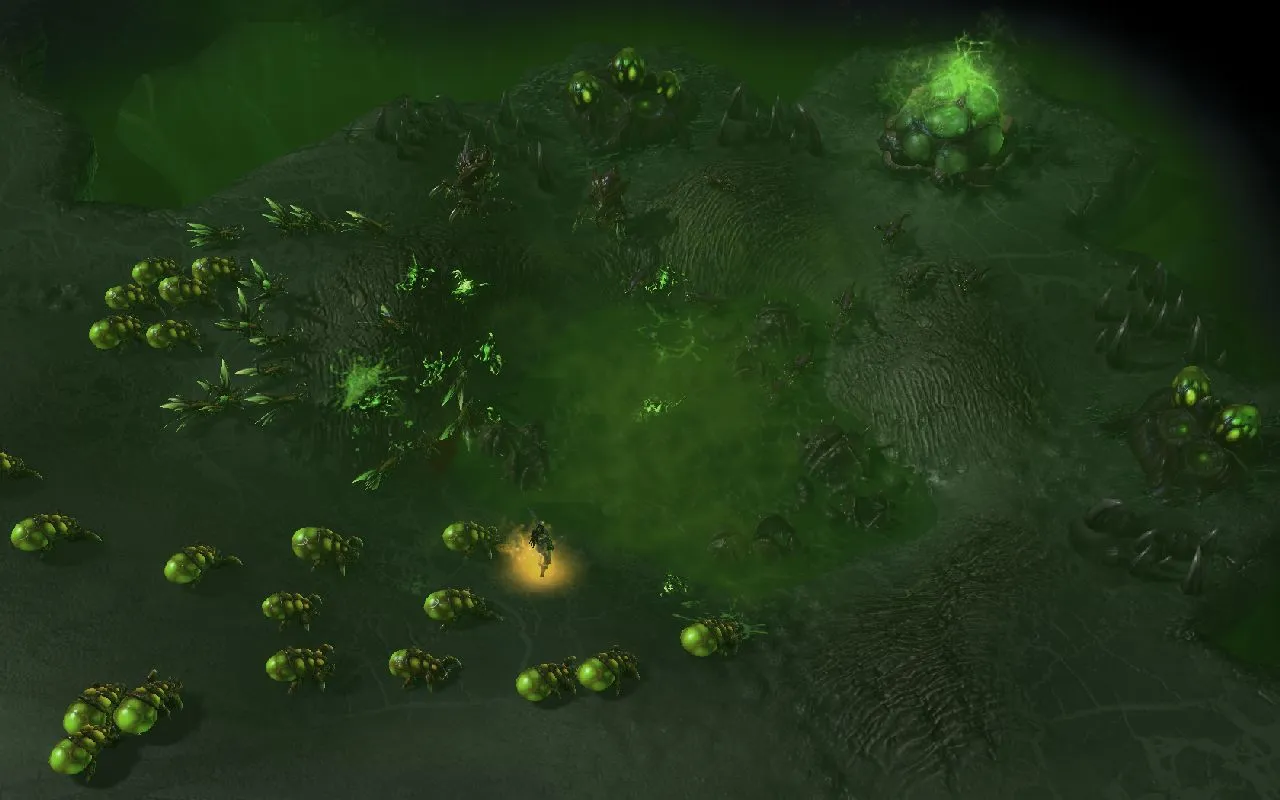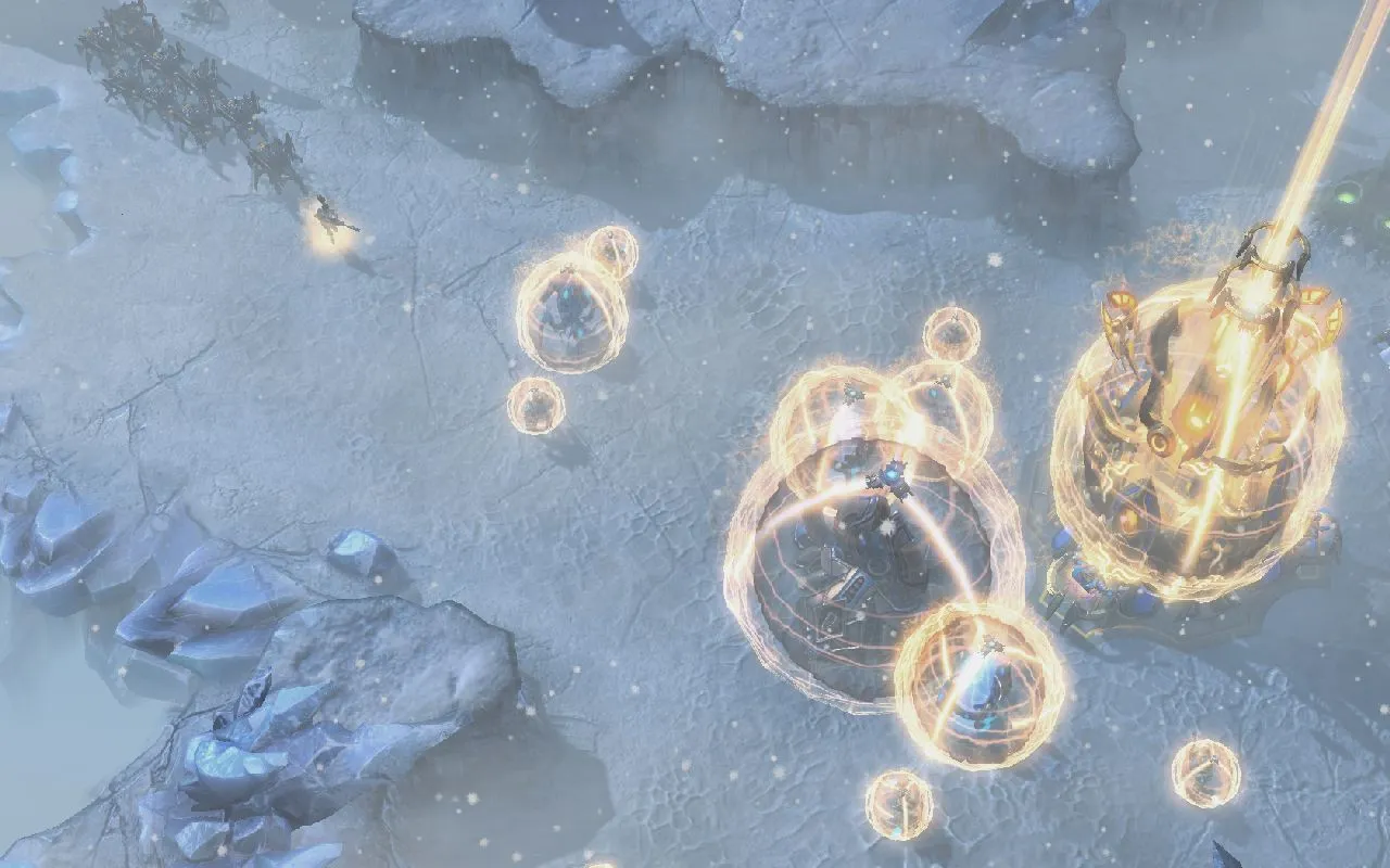 The screens in the media gallery below illustrate the two playable missions from a recent Blizzard press event. You can see the frozen winds of the Kaldir moon freezing Protoss and Zerg alike, and the battles for a cache of baneling eggs in the acid pools of Char.