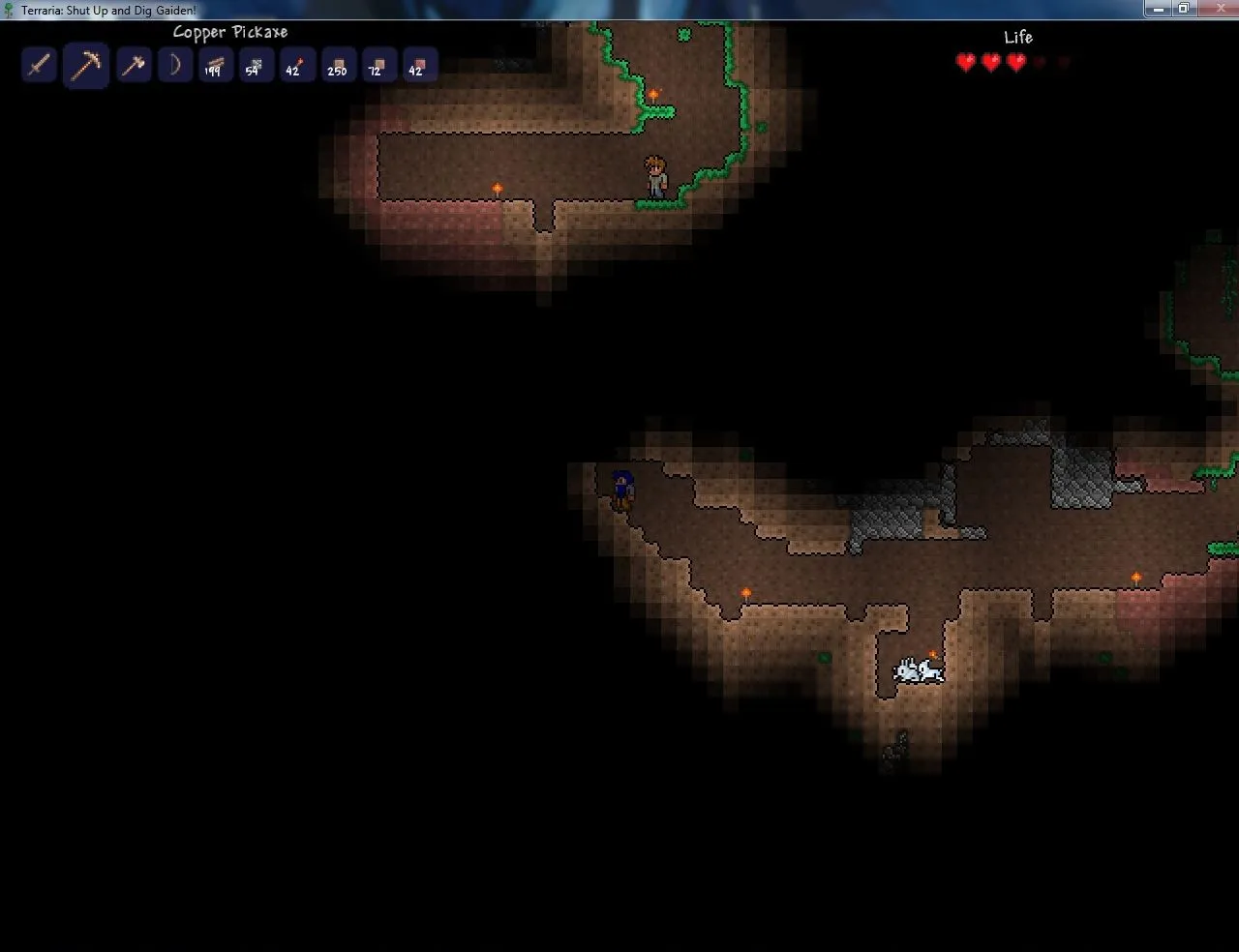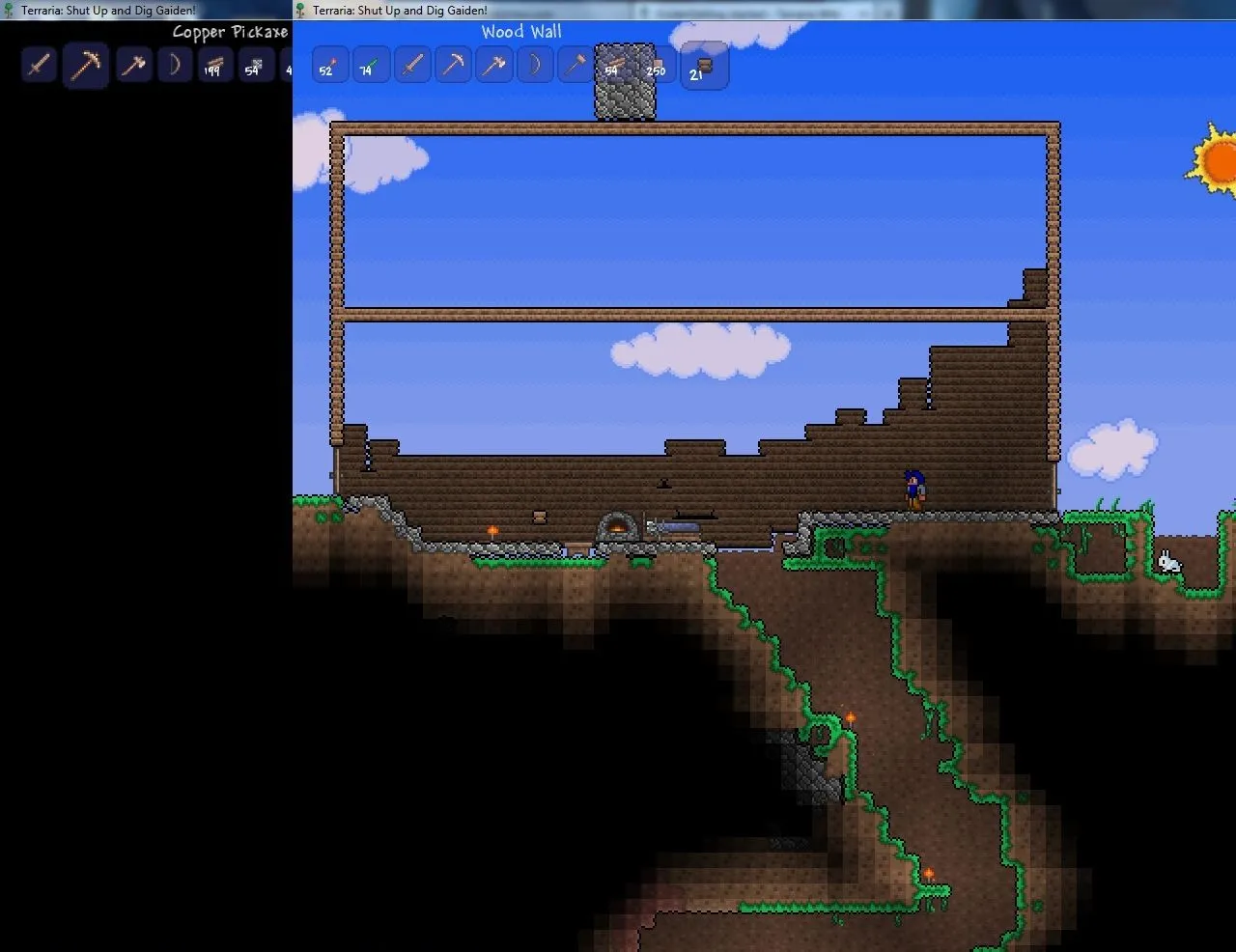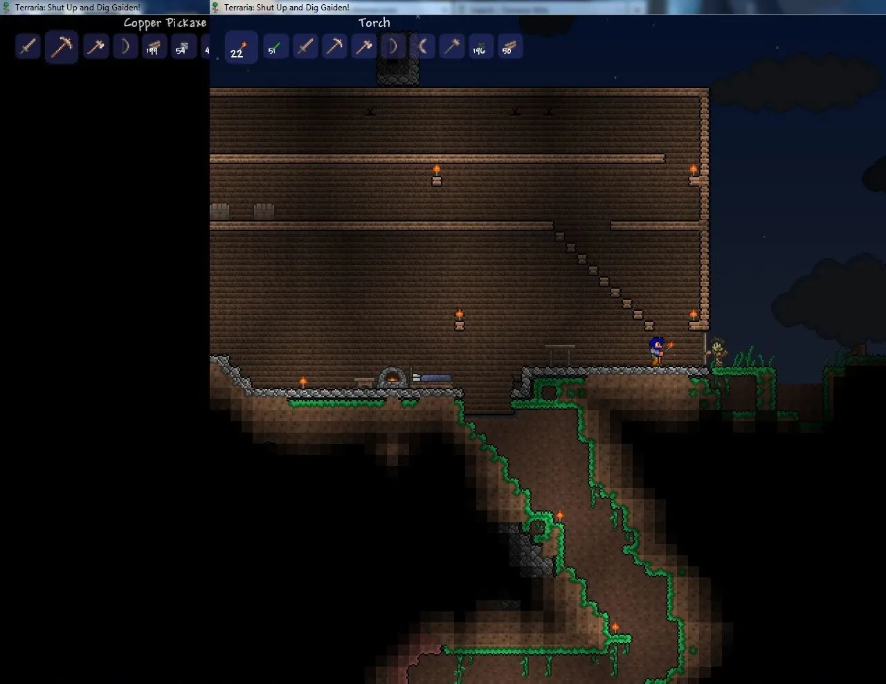 Like in Minecraft, deadly enemies attack at night so it’s important to build a shelter right away. After chopping down a few trees I constructed myself a humble hovel to ward off zombies and flying eyeballs. Over the course of my numerous hours with Terraria I joyfully expanded my home into a three story structure with plenty of chests for storage, crafting stations, doors, and even an opening into my own private mineshaft.