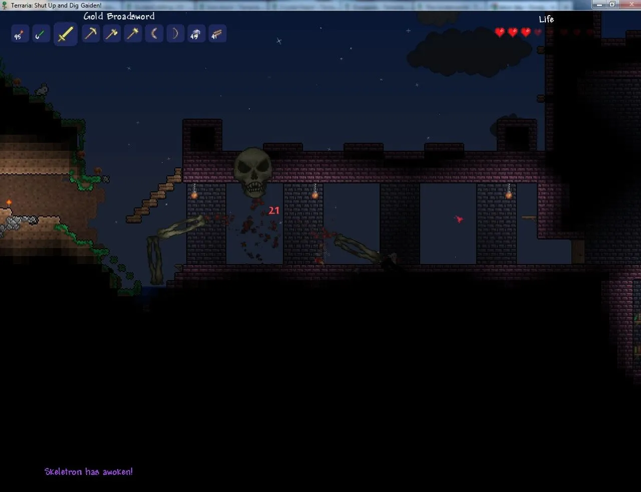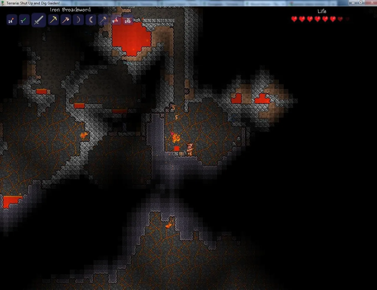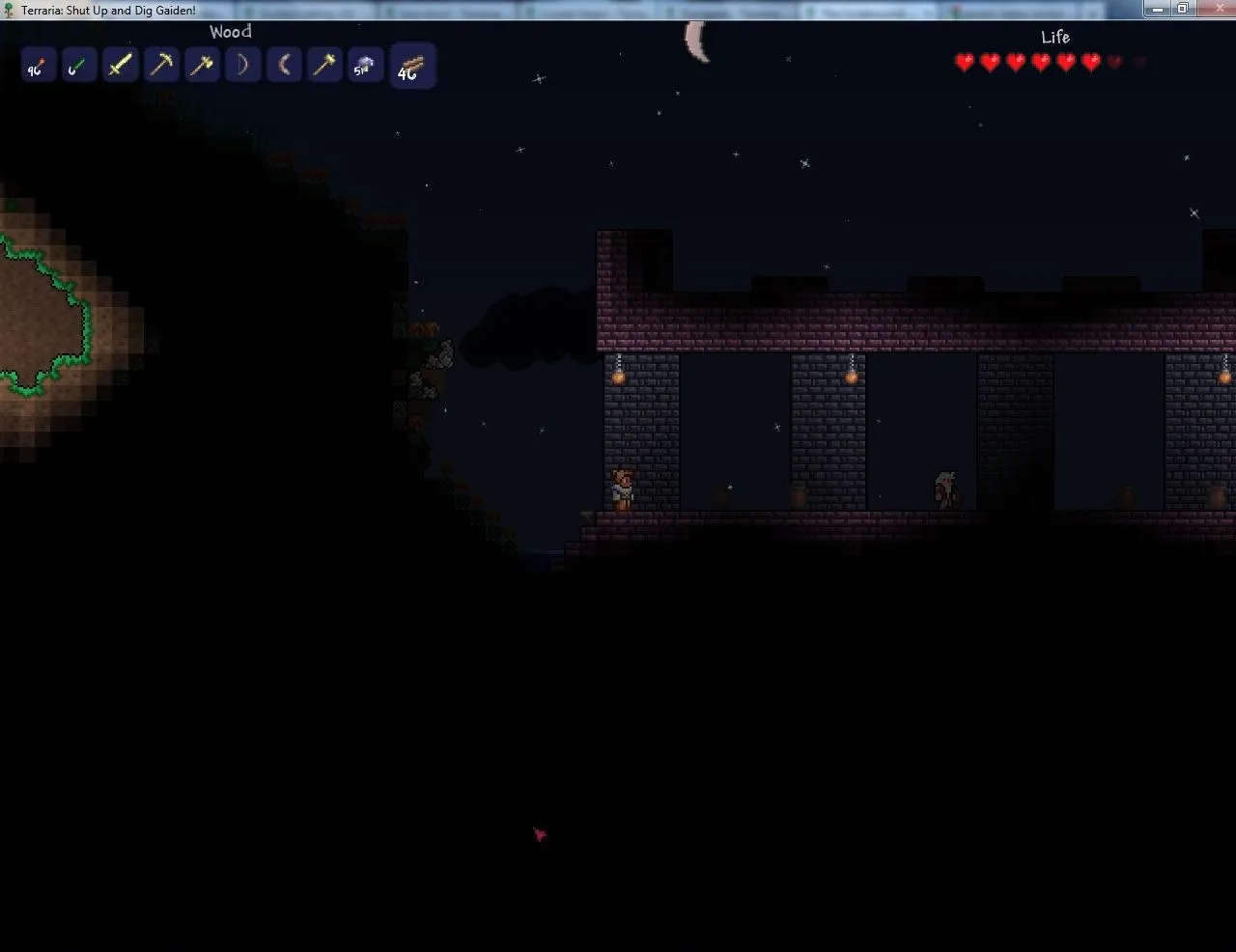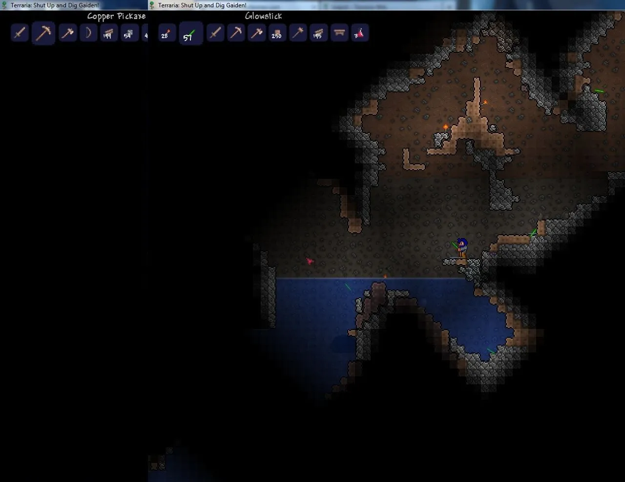 Like in Minecraft, deadly enemies attack at night so it’s important to build a shelter right away. After chopping down a few trees I constructed myself a humble hovel to ward off zombies and flying eyeballs. Over the course of my numerous hours with Terraria I joyfully expanded my home into a three story structure with plenty of chests for storage, crafting stations, doors, and even an opening into my own private mineshaft.