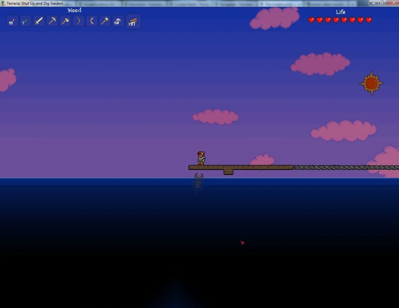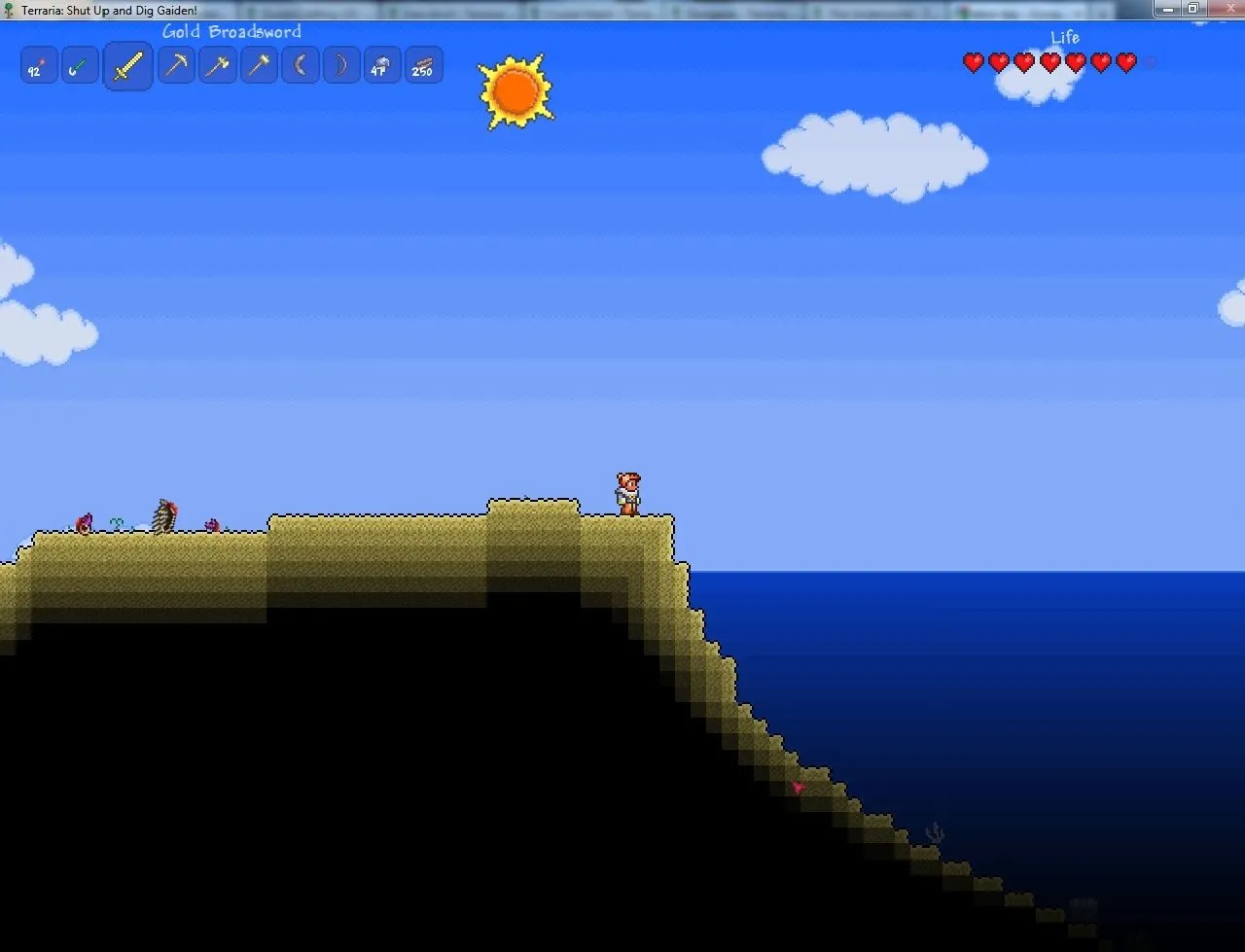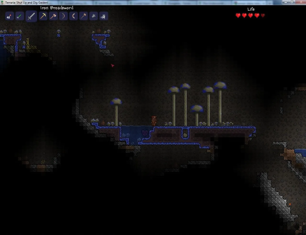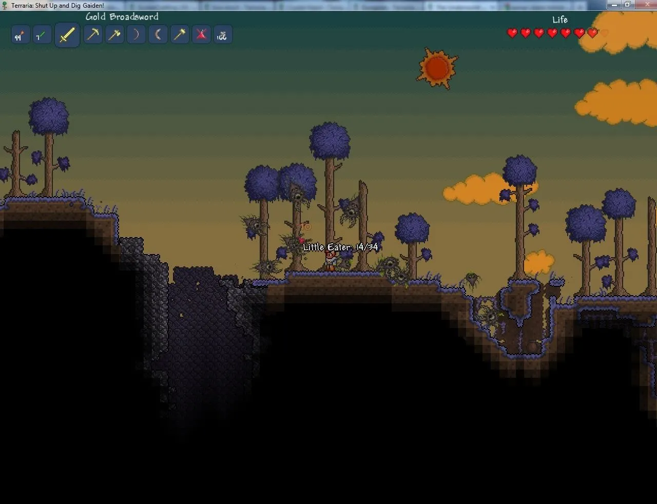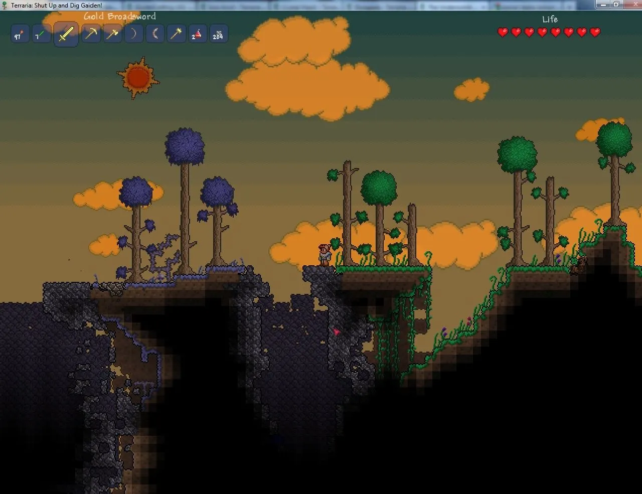During my exploration I dug deep enough to discover vast caverns with luminescent mushrooms, and even found a fiery hell world with molten lava and fire imps. These areas become progressively more challenging, requiring players to enhance their weapons and armor frequently. The game not only changes when digging downwards, but traveling laterally reveals new regions. I uncovered an unsettling, corrupt landscape with flying abominations and venomous mushrooms. I also saw desert areas, huge forests, and oceans bookending either end of the world map. Every world sports a dungeon guarded by a high level boss. While I was too underpowered to take on the guardian, I’m sure there are lots of goodies within to be uncovered. The real kicker is that I was playing in one of the Terraria’s small maps, which means the medium and large worlds must be tremendous.