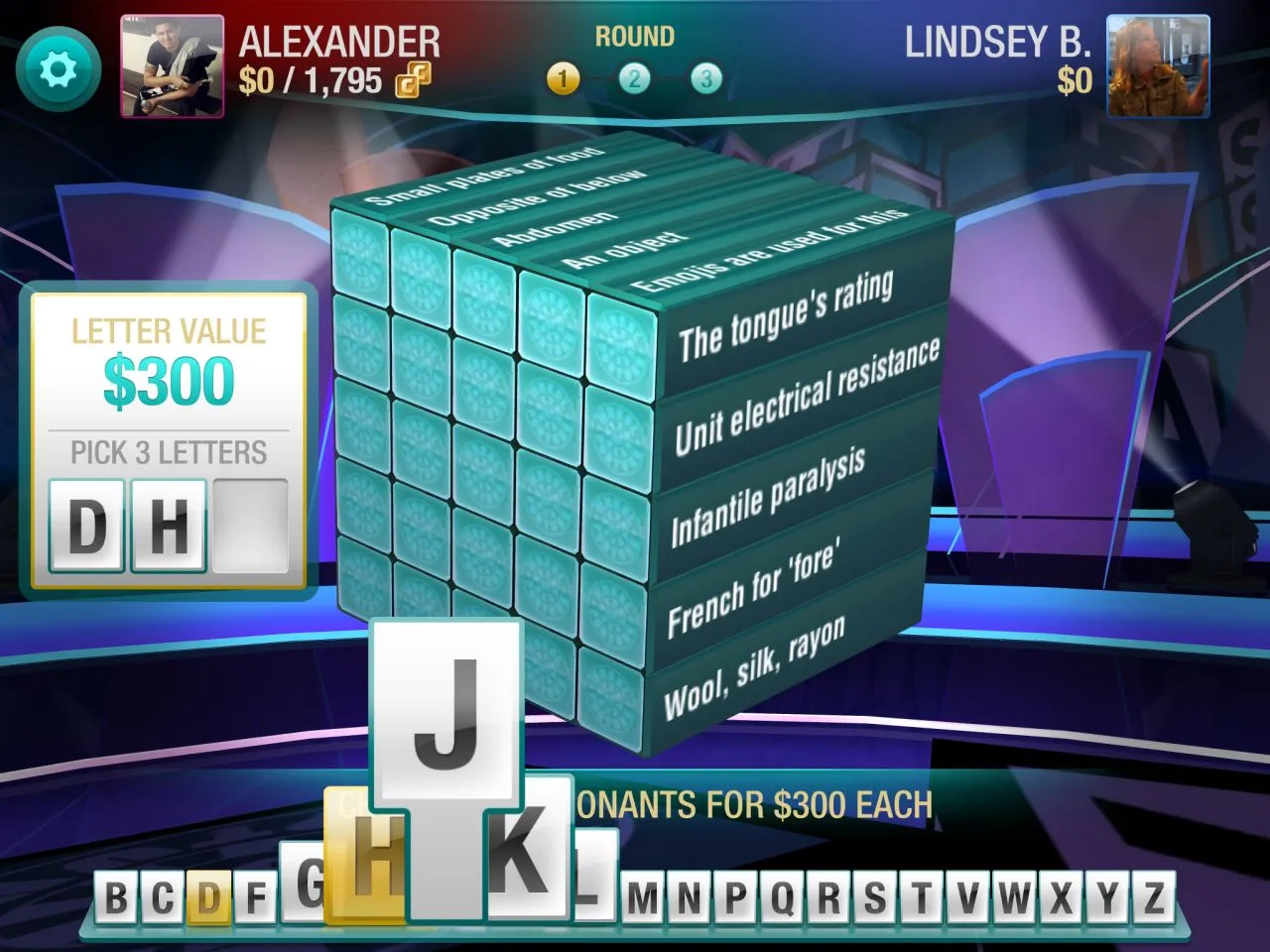 Wheel of Fortune: Cubed transforms the traditional Wheel of Fortune game board into a 5x5 cube. Players still spin the iconic money wheel, but instead of solving one long puzzle, each session consists of five single-word puzzles. The screenshots above and below explain the game’s mechanics best.