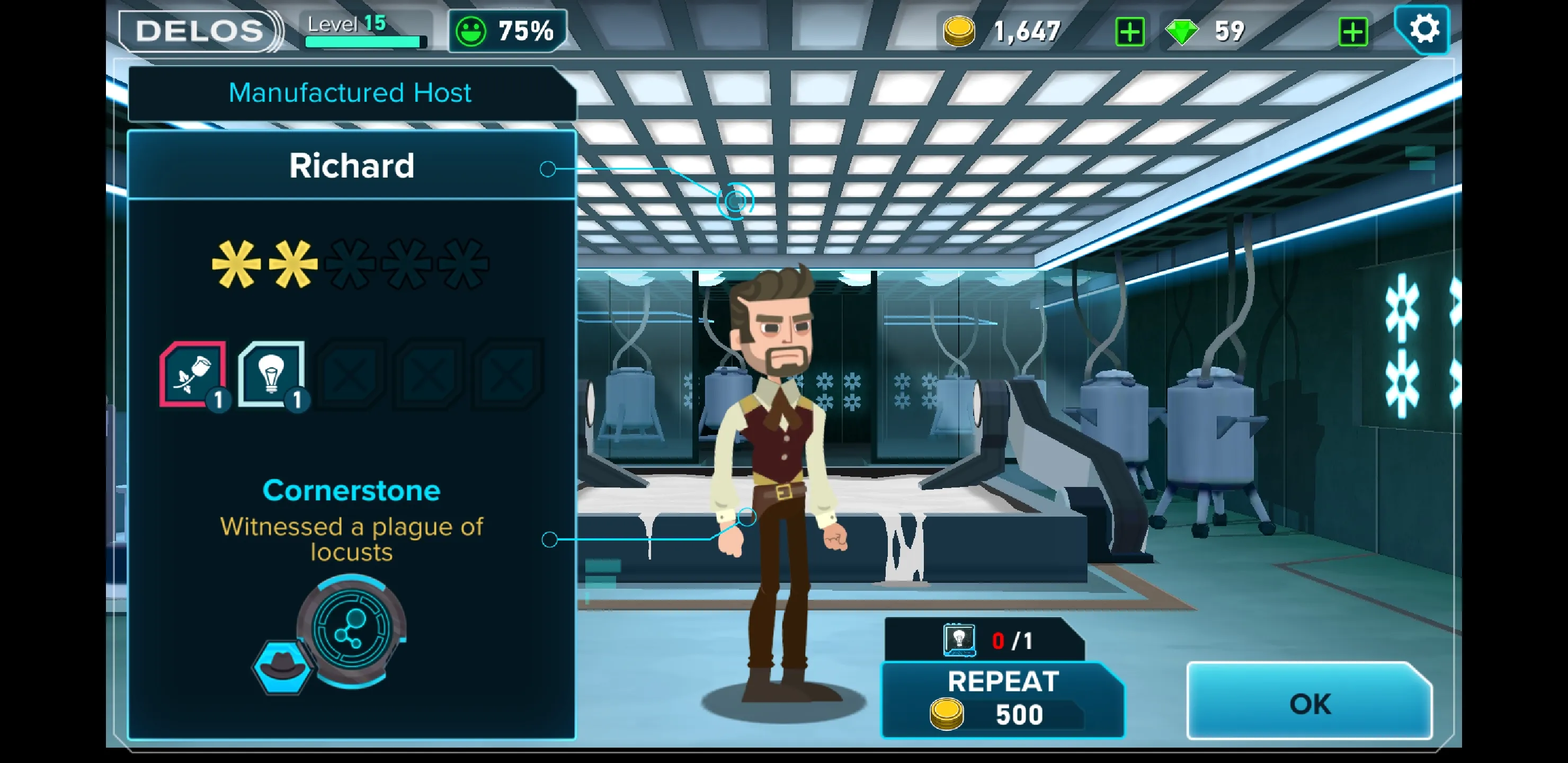 Next, the host interactions are simple to a fault. Guests wander into buildings, and your job is to match them up with the hosts that best meet their desires. Maybe a guest wants a little romance or is looking for a robbery opportunity. After pairing them up, you wait for the interaction to end and then you’re given rewards. Your roster is limited at first, but you can build more hosts from vats of milky goo (it’s Westworld, don’t ask). If you have duplicates (and you will get duplicates, thanks to the lootbox-style structure), you can sacrifice them to level up those hosts, so they can handle more difficult guests. Mismatches can have painful consequences; if a guest is disappointed in the interaction, they’re liable to pull out a pistol and shoot your host dead. Once a host is killed, you have to repair them (with another in-game currency) before you can push them back into service.