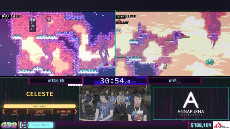 Another excellent run is Celeste, this year's indie platforming success, right here on Twitch. The two runners, TGH and yoshipro, hold the first and second best times in the world respectively. The commentator couch includes the team behind the game who talk about all the intended (and unintended) speedrun tech in the game. It's a tight race you definitely won't want to miss.