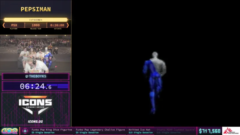 Finally, you must watch Pepsiman. Based on a Japanese ad campaign of a, well, Pepsiman, the Pepsiman is a running game for the PS1 run by theboyks. This speedrun includes all the cutscenes, which has a man looking at the camera and saying "Pepsi TV Game" and that's it. Fun note: Kotaro Uchikoshi, the writer and director behind the Zero Escape series, was the 3D modeler for this infamous game.