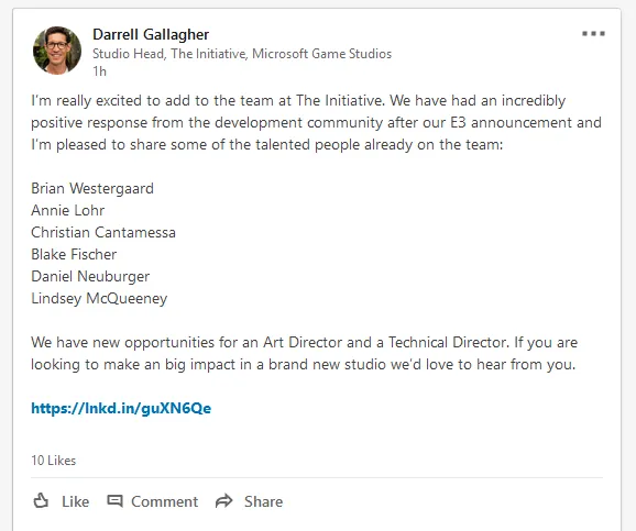Microsoft's new internal studio The Initiative, announced during the company's E3 showcase, has hired a slew of industry veterans. Ex-Crystal Dynamics head Darrell Gallagher, The Initiative's studio head, announced six new hires via LinkedIn, according to GamesIndustry.Biz. Gallagher later deleted the post, but ResetEra user CrimsonEclipse posted a screenshot of his post.