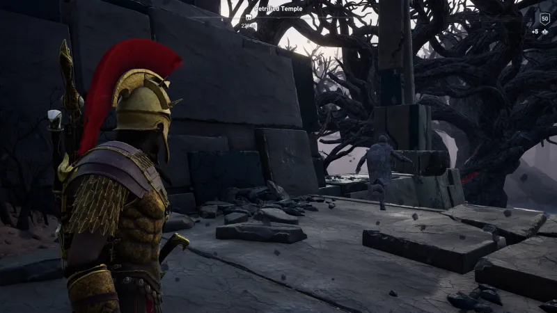 Bryce leads Kassandra to the dread ruins, where she was to meet her lover Ligeia earlier. Ligeia’s tribe is called the Daughters of Artemis, a community of female hunters that trained in the petrified temple long ago, and believed it held a sacred artifact. Bryce arrived later to their meeting in order to bring her girlfriend a rose, only to find Ligeia missing and presumably inside the temple. According to Bryce, the Daughters of Artemis held on to a key for the temple in their village, which she tasked Kassandra to bring back. She also mentioned that a mercenary had claimed to kill the creature before and could possibly provide tips.
