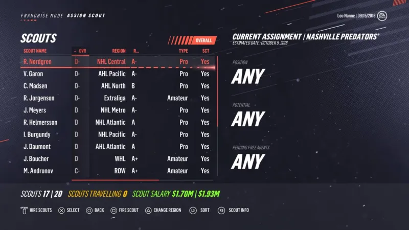Before you jump into View Draft Class, analyze your organization’s prospect pool to figure out what your weaknesses are. Are you lacking grinders and two-way forwards in your bottom six? Do you have a dearth of offensive defensemen? Maybe you lack a pure sniper? Once you understand your organization needs, jump into the View Draft Class menu and seek these positions/archetypes out. You still want to draft the best players available in every round, but knowing when there are players who are good but also fit positions of need is a great tiebreaker when looking at two prospects with similar skill and potential. When you press R3 to see a player’s info that matches your weakness, you should see the button option for scouting the player. If you don’t, that means a scout is already assigned to check out the player.