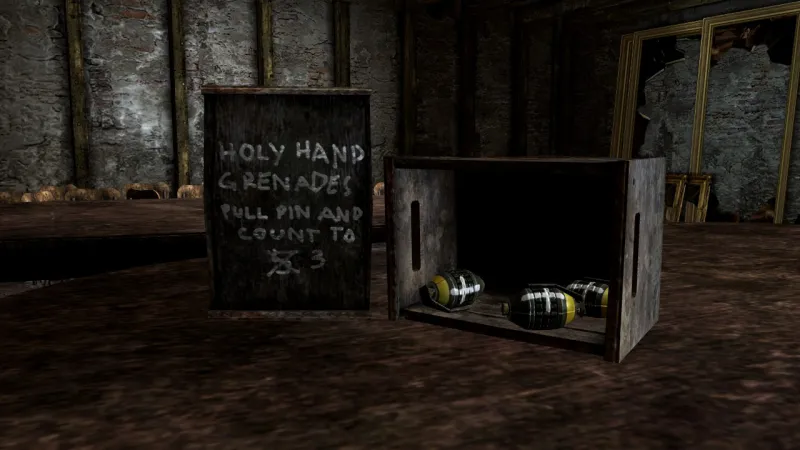 While the names and art styles slightly differ, both of these hand grenades derive from the quotable scene in Monty Python and the Holy Grail where the Knights of the Round Table encounter a man-eating rabbit. Like the alien blaster, players in Fallout: New Vegas need to select the wild wasteland trait to discover this unique explosive. In Fallout 2, players discover the holy hand grenade through a random encounter that involves a bunch of Brotherhood of Steel knights dubbed “King Arthur’s knights” who get slaughtered by a small rat. If the player walks up and shoots the rat between the eyes, the holy hand grenade can be found in a dank cave, complete with a cross for a firing pin.