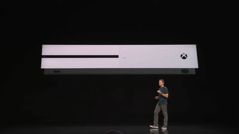 "To put it another way," Ternus said while the slide on the screen behind him changed to show a picture of Microsoft's white Xbox One S, "the iPad Pro delivers Xbox One S-class graphics performance in a product that's 94% smaller." Amid the applause, he adds "And there's no AC cord required."