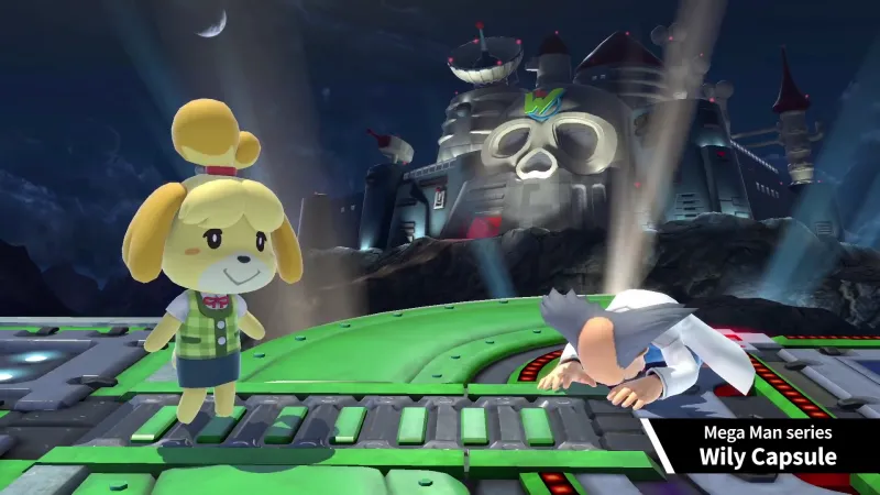 While Wily has gotten on his knees and begged Mega Man to let him go quite often, this assist trophy references one of the darker ones. The trophy itself is of Wily Capsule 7, one of the most frustrating final Wily fights in the series, as he produces energy balls that home in on poor Mega Man. After being defeated, Wily falls to the ground. In both the Japanese and western versions, Mega Man threatens to end Wily for good and Wily begs for his life. It diverges a little here depending on the version you're playing. In the Japanese release, Mega Man simply stays silent, hesitates, and Wily gets away. In the American version, Mega Man says he is more than just a robot, and punctuates his point by yelling "Die, Wily!" who then gets away, anyway. In the Smash Bros. reference, Isabelle breaks Wily's capsule and then lets him go, because Isabelle threatening to kill someone would be weird.