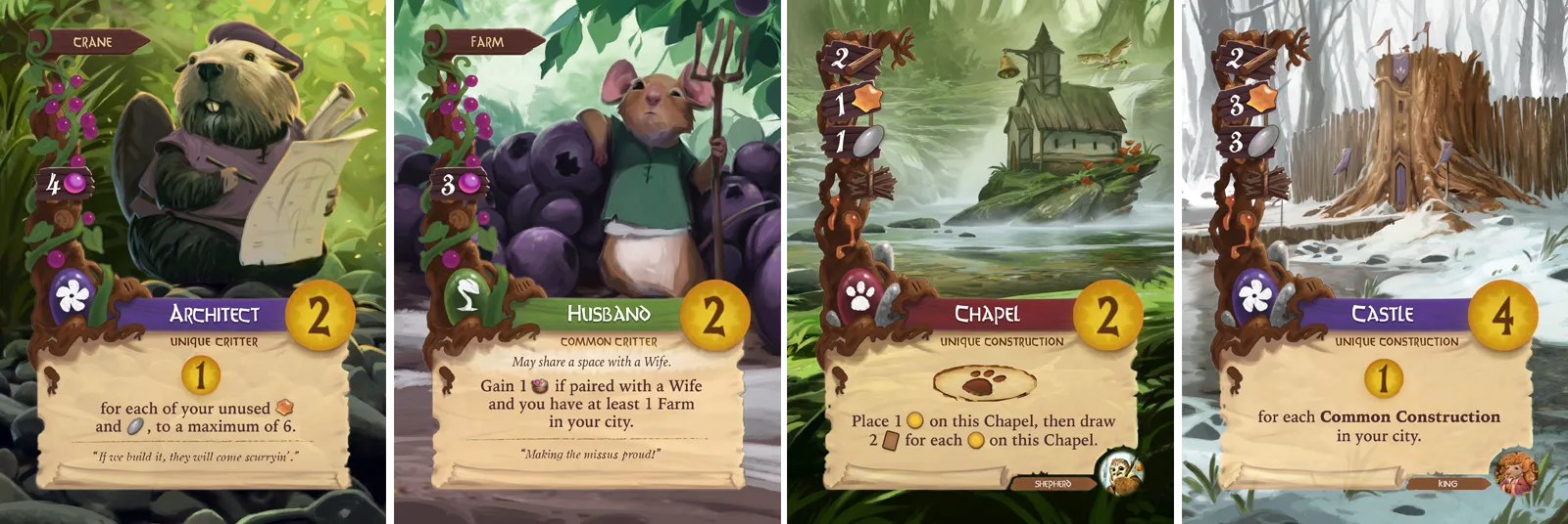 Clearly inspired by classic tales like The Wind in the Willows and the Redwall novels, Everdell transports one to four players to an idyllic woodland valley where bespectacled bats hang from clock towers, hares keep shop at the general store, and postal pigeons dutifully haul letter bags between communities. Much of the charm is captured by the plentiful card illustrations by artist Andrew Bosley, which deserve a callout as some of the most evocative and imaginative of any game in my recent memory.