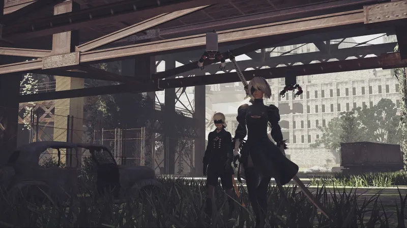 Yoko: But I can say, in one of the trailers is A2 fighting one of the Engels, one of the big robots. She actually has long hair in the trailer, but in the actual game, it's after she cut her, so she would have had shorter hair. That one was actually intentional, because we did not reveal before the game that A2 would cut her hair, so we actually made a scene specifically with long-haired A2 to take that trailer. So that's that shot was kind of a lie.
