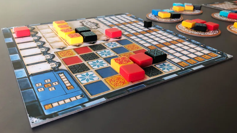 Beyond strategy, Azul is also just a beautiful game to look at. Like the azulejo artform from which the game draws its inspiration, the table layout of a game is eye-catching and colorful. The tile components are solid and make a satisfying clink as you shake the bag to randomize them. The cardboard player boards and factory displays look great – my only complaint is that the score tracker on your board has a bad tendency to get jostled if you’re not careful. I also really like that the player boards are double sided, offering a more freeform wall layout on the opposite side, and a variant style of play to explore once you grasp the standard experience.