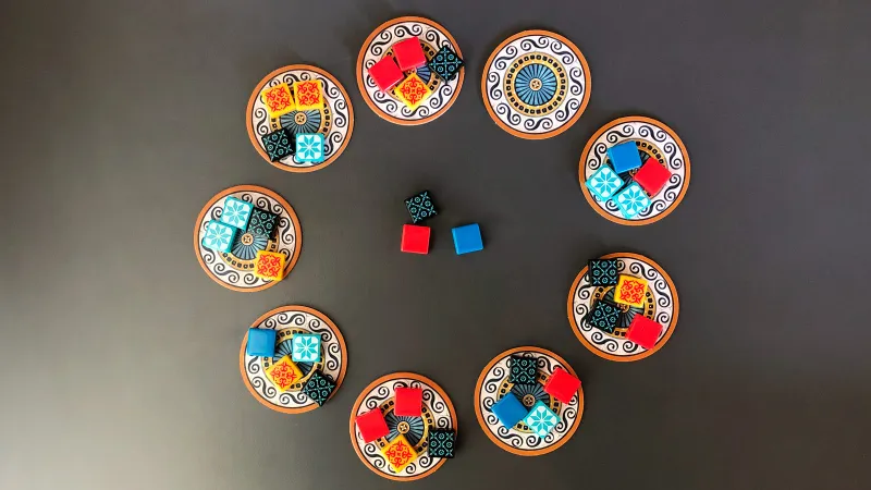 To set the game up, players each get their own board that represents the wall where you’re constructing your tile art. At the center of the table, several factory displays represent the places where you might be acquiring tiles of different colors/patterns, and each of those displays has a number of randomly selected tiles (drawn from a bag) to consider. You can draft tiles from these factory displays, but you may only take tiles of one color in a given draw – the rest go to the center of the table, where they become available to your opponent artists.