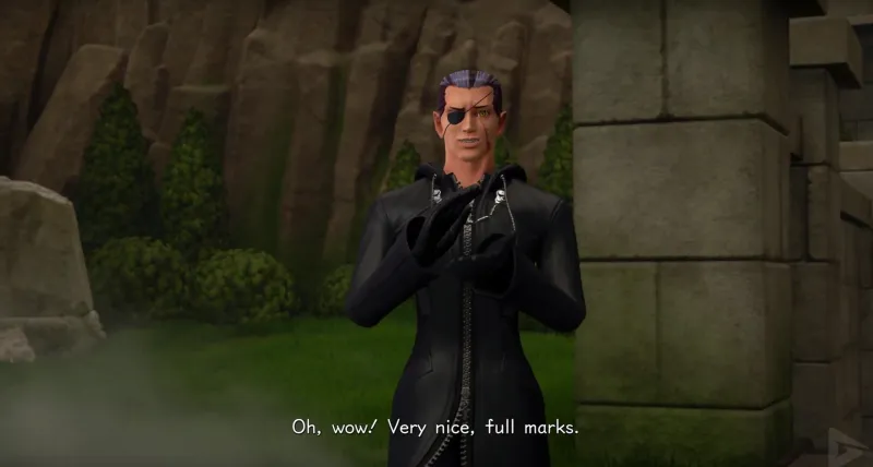 Another evil-looking character named Xigbar emerges from a portal.