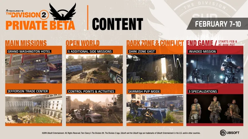 The Division 2's private beta kicks off on February 7. Today Ubisoft outlined what exactly players will be experiencing when they walk into the decimated nation's capital for the first time.