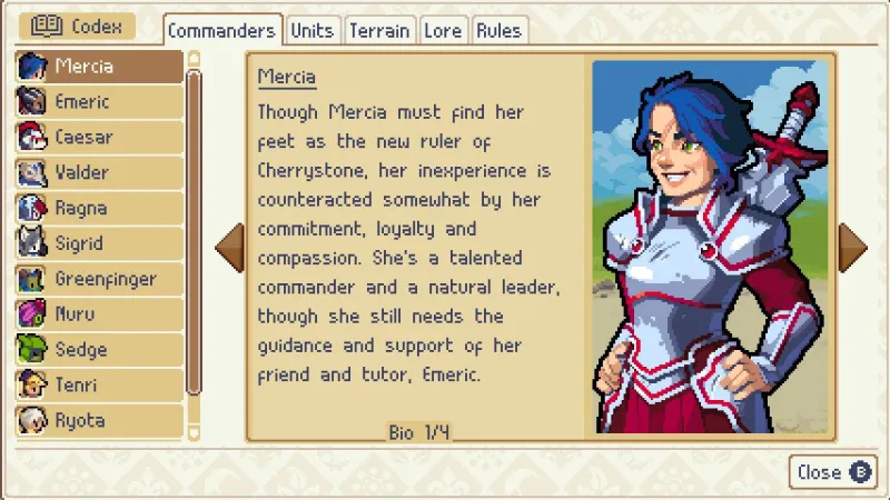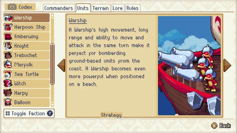 Commanders taking charge on the battlefield isn’t unique to Wargroove (Advance Wars: Days of Ruin did this as well), but how they work in Wargroove is completely different, mostly toning them down in effectiveness. Commanders are more powerful renditions of soldiers, beating out any other ground unit in a one-on-one battle (they can’t attack air or naval units).