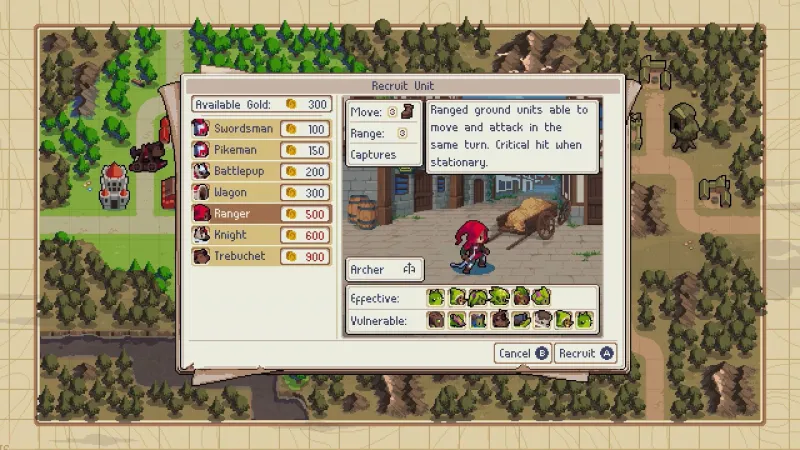 In Advance Wars, any unit standing inside a city was slowly healed at, though it cost you funds proportional to that unit’s worth. Healing units with villages also costs you in Wargroove, but a village’s health also factors in, as a village loses health whenever it heals a unit.
