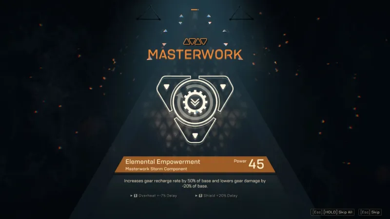 During my run at The Temple of Scar, I got my first masterwork drop, the highest rarity of item in Anthem. It made the kind of distinct, exciting noise you might expect from a coveted drop in a loot-based game, but I wasn’t able to see what it was until after I’d completed the stronghold. I ended up getting a masterwork elemental empowerment for my Storm that offered some pretty powerful stat increases. It... kind of bummed me out, to be honest.