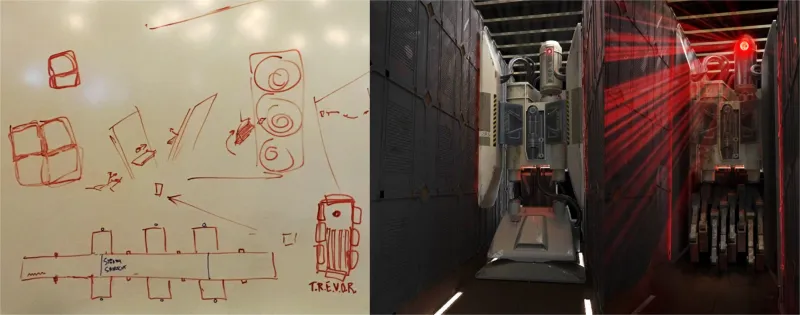 Alex May (Senior World Artist): Early on we decided that four switches would control the exit from TR3-VR. During play tests we noticed that players who knew what to do would blitz through the space and likely never even encounter TR3-VR. Thus the lightning gates were born to act as a “gating” mechanic, forcing players to slow down and utilize the small duck outs to avoid death. All these thing culminated in the final experience and a focus on messaging with the glass overlook, computer panel and light indicators for which buttons had been pressed. Right near the end of production though, we hit some technical snags. TR3-VR did not have consistent positioning across multiple fire-team members. Because of networking limitations we were hitting hard limits with the lightning gates, the puzzle and TR3-VR all existing in a single bubble together. At the last minute we needed to split Zero Hour into multiple areas to break up the networking requirements. This was a risky prospect so late in development, specifically for test. After splitting the bubbles, we were no longer hitting network limits and after the engineers and animation experts got their hands on TR3-VR, he was working like a charm.