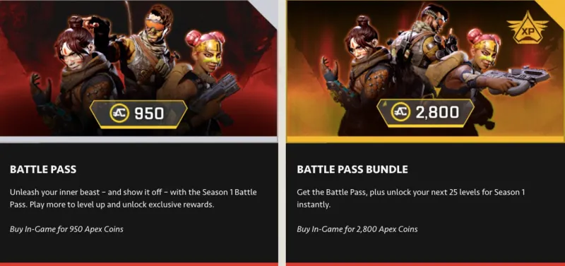 The battle pass just doesn't have much going for it, since key rewards include things like Season 2 win stat cards for each character, apex coins, apex packs (lootboxes, basically) and some exclusive cosmetics. A few of the skins for both characters and weapons do look neat, like Caustic's Prince of Darkness outfit, but none of the unlockables match the coolness of Fortnte's John Wick-But-Not-Actually-John-Wick skin, or even Black Ops 4's various Operator skins.