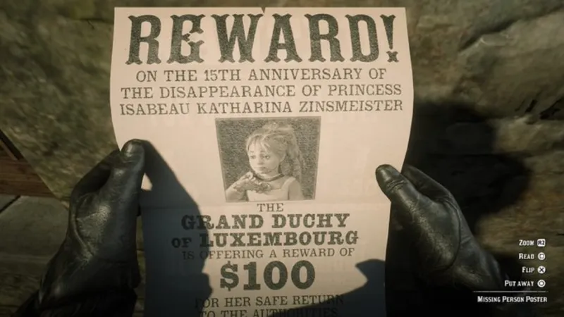 There is little to go off of in terms of clues. A piece of luggage with the Princess’s initials and the royal seal of Luxembourg can be found at the fence’s shop in Van Horn, but really… that’s it. We don’t know anything else. This kind of disappearance is especially concerning, considering there are at least four (human) serial killers in the world of Red Dead Redemption 2, not including the numerous murderous gangs roaming the map. The chances of finding Princess Isabeau 15 years later are slim, but it must have been included in the game for a reason, right? Eh, she probably went wherever Gavin went.