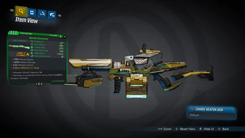 After an hour of common trash, the magic happens. I kill a bad-ass skag and find my first love: the Hyperion Hostile Downsizer. This bucktastic bulldozer comes fully augmented with a bayonet, frontal shield, and most importantly, incendiary rounds. Sure, incendiary rounds are everywhere, but what makes this special is how it augments Moze: the gunner class. It’s possible to increase her incendiary potential both passively and after reloading – delighting my inner pyromaniac. The occasional spark evolves to constant immolation – downsizing every enemy to ash.