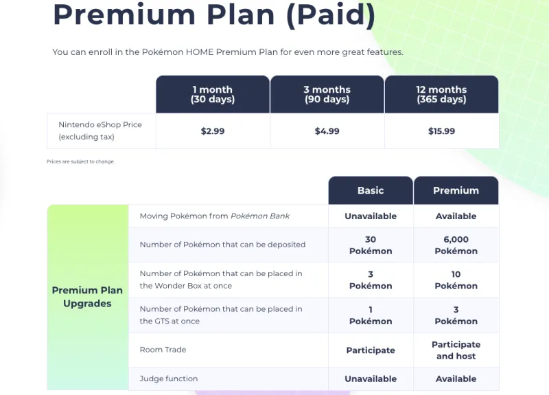 The Premium plan, meanwhile, greatly escalates the number of Pokémon you can deposit to up to 6,000, allows Pokémon to be moved from the 3DS via the Pokémon Bank, and more. Details – included pricing per month – are elucidated in the chart from Nintendo below (click to enlarge).