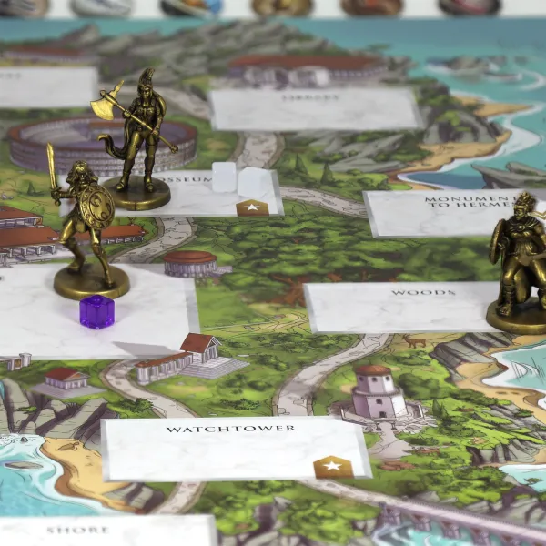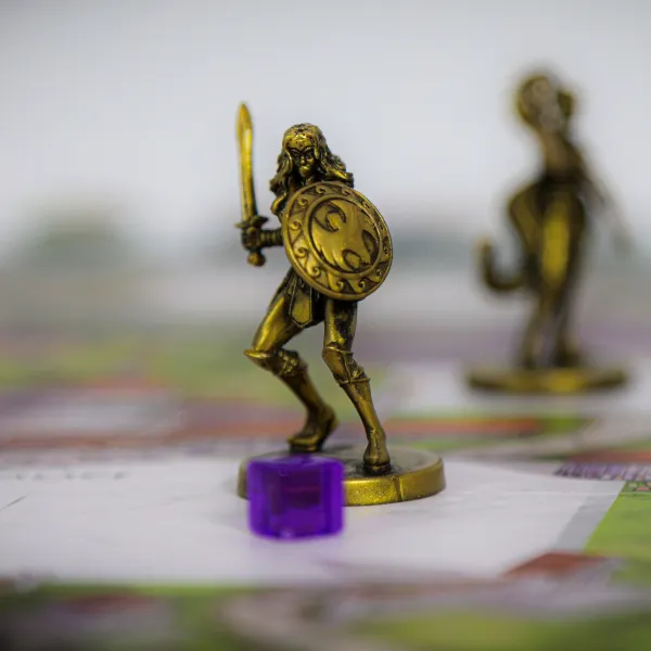 While I don’t always feel compelled to highlight a game’s components, I was especially pleased with the clean presentation, stylish art, and cool miniatures that are included within Challenge of the Amazons. The cover art talents of Jenny Frison (who has an established history with envisioning the character for comic book covers) captures the stoic and heroic vibe of the Amazons. Internal cards and board components feature a soft white undertone that calls to mind marble columns. And the well-sculpted miniatures of the heroes are all painted in a deep bronze color, suggesting the classic statuary styles of Ancient Greece, and further accentuating the mythological vibe.