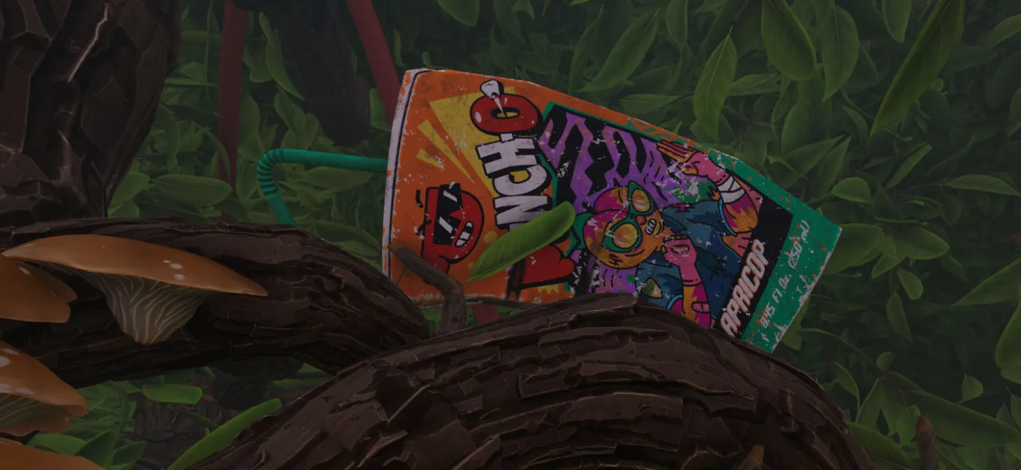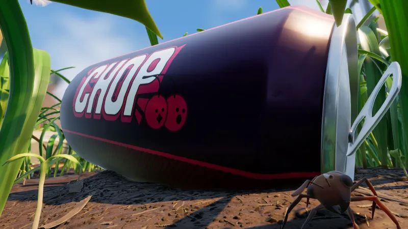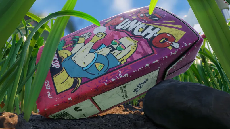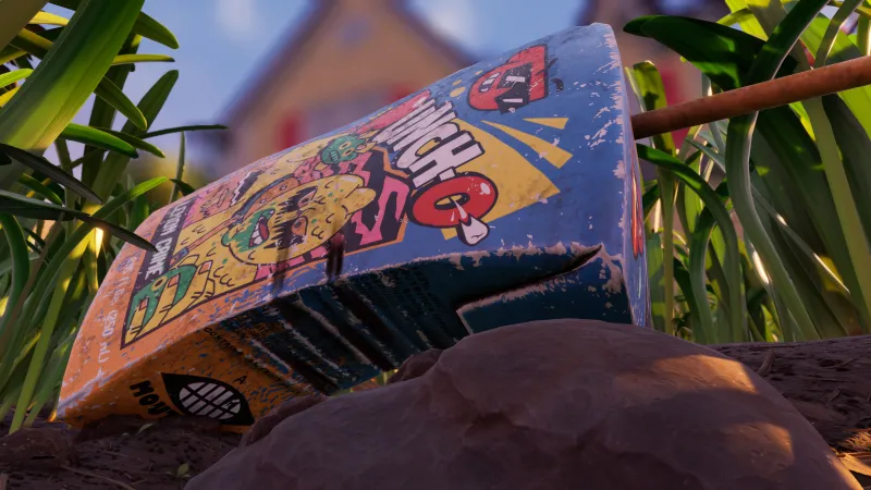 At Grounded’s scale, an ordinarily unassuming juice box becomes an imposing landmark. The rectangular object is immediately recognizable, with a bent straw jutting out of one end and dribbling juice onto the ground. Dunny says making props for Grounded has been significantly different from his work on Fallout: New Vegas, for example. Since small details are scaled up, it’s important that objects feel authentic. “I’m actually looking up diagrams of how juice boxes are folded together and the manufacturing process to get that sort of thing right,” he says.
