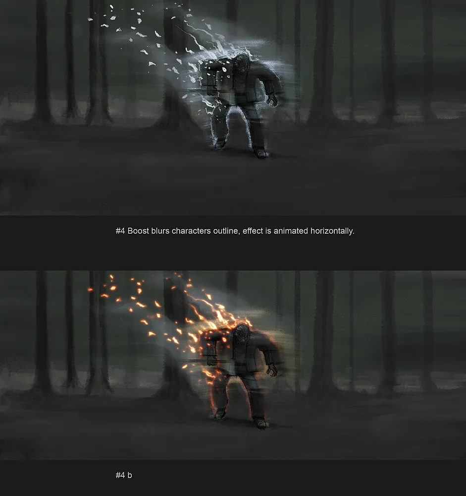 That was part of the exploration. He gets winded running around the forest. We wanted these small elements to not be in the way of the action experience, but remind you that he isn't a perfect master when it comes to action. He is afraid and you feel he's in a tight spot. He's no superhero. Of course, the other aspect of the story that is present is his fiction is coming true and he's able to affect things through the fiction. These things can also help him and give him the possibility to overcome.
