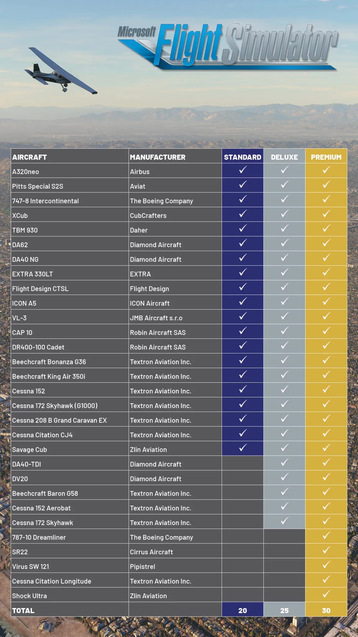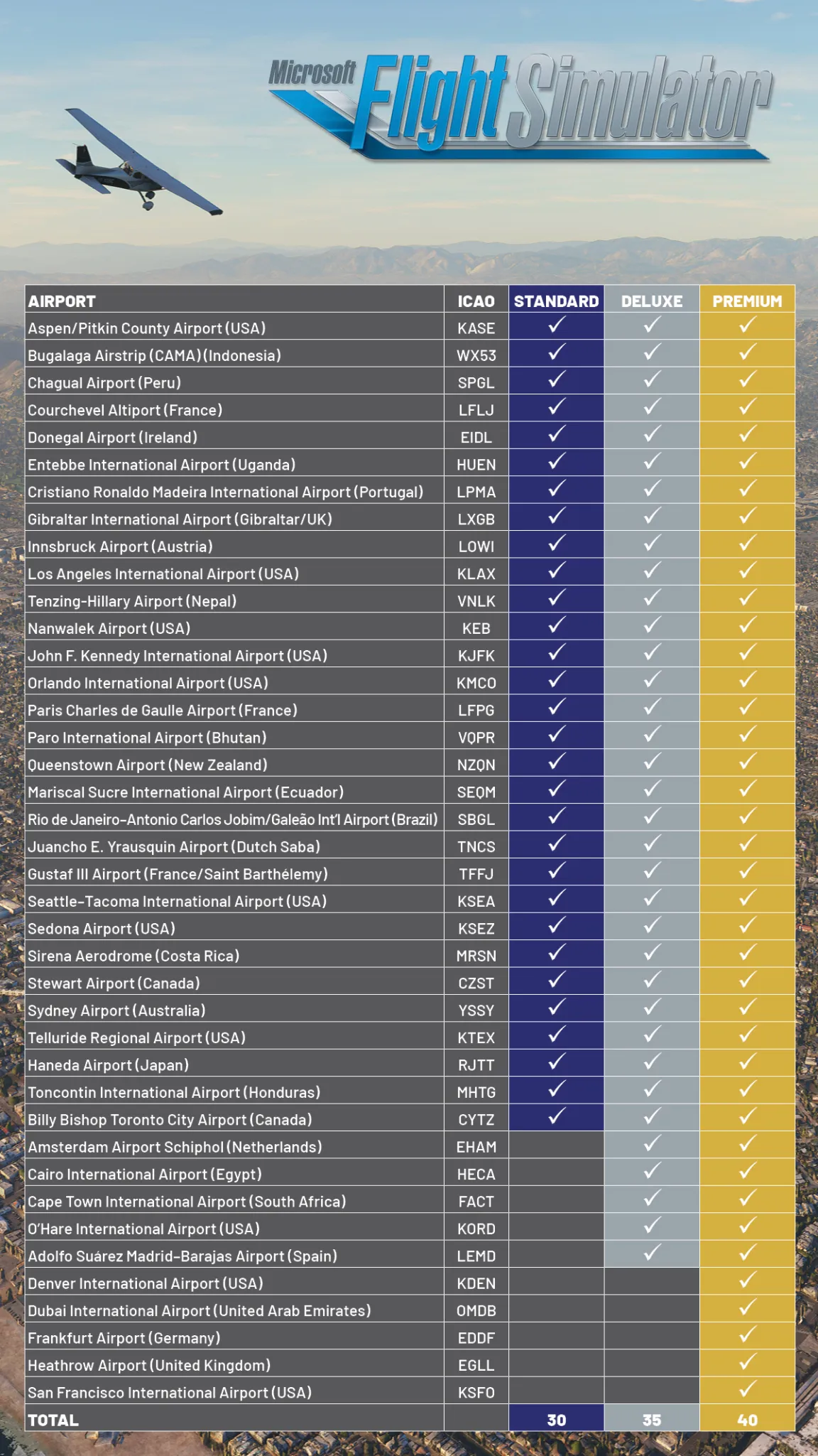 Standard edition gets you 20 different planes and 30 airports for $59.99 (Or an active game pass subscription). From there, the Deluxe Edition comes with five more planes and five more airports for $30 more at $89.99. The Premium Deluxe edition will run you $119.99, but is the only way to get some of the elite airports, like Denver International Airport, SFO, Heathrow, and more. Several awesome plane choices are also locked behind the premium edition, such as the SR22, Shock Ultra, and the 787-10 Dreamliner. See the handy charts below for details. You can read more about the upcoming release over on the official site.