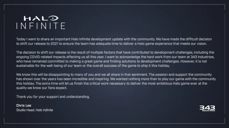 343 Industries studio head Chris Lee has released a brief statement through the official Halo Twitter, explaining that the developer has made the difficult decision to delay Halo Infinite into 2021.