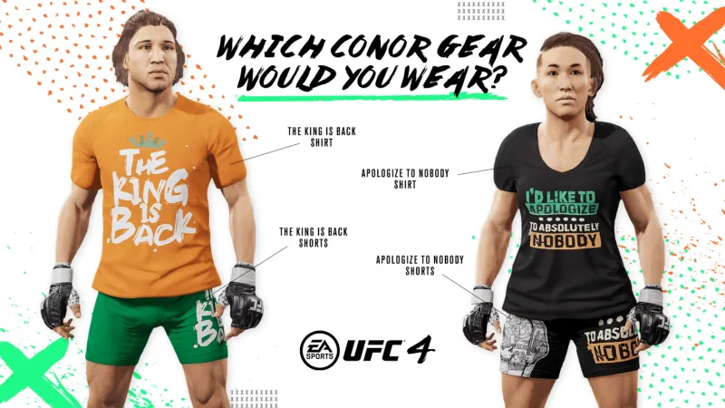To continue the Conor celebration, new McGregor-themed vanity items for your created fighters have been added to the in-game closet. These items include an orange shirt and green shorts that say "The King is Back" and a shirt and pair of shorts that say, "I'd Like to Apologize to Absolutely Nobody," – an abridged version of McGregor's famous quote after capturing the lightweight belt at UFC 205 in 2016.