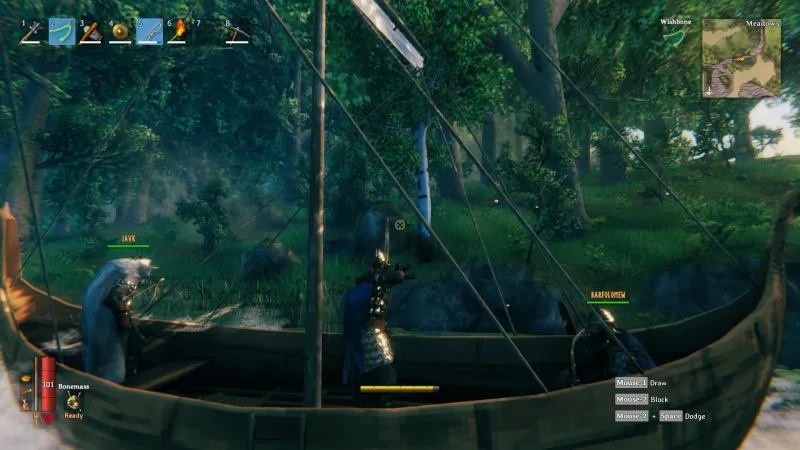 Valheim’s structure is immediately discernible and understandable even for players far removed from the survival genre. Essentially, each biome is a tier and ruled by a boss. Farm the zone for resources, make new gear and recipes, kill the boss, rinse and repeat with tools to tackle the next zone via the boss drops. The boss battles create server-gathering events for you and your friends, and if you’re playing with a particularly inquisitive or adventurous group there are creative ways to sequence break the natural order of progression. The key here really is that the game is understandable from the get go, with a helpful crow giving players tutorial steps. You don’t need to worry about making fifty other items to craft a single item or complex multifaceted crafting schools, it’s just get up and go and start making progress in your world.
