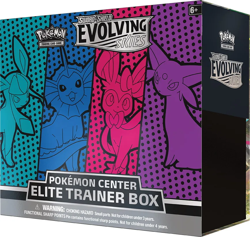 Evolving Skies includes 15 Pokémon VMAX cards, 18 Pokémon V cards, 33 full-art Pokémon V cards, 24 trainer cards, and 5 full-art supporter cards, as well as a new special energy card. The expansion will be available through booster packs, special collections, and two different versions of the standard Elite Trainer Box; one Elite Trainer Box features Umbreon, Flareon, Jolteon, and Leafeon, while the other features Sylveon, Vaporeon, Glaceon, and Espeon.