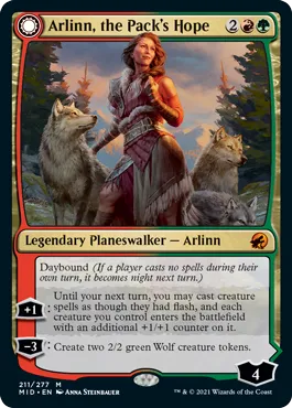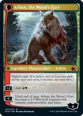 Easily the most complicated set mechanic, Magic now has a day/night cycle that will affect the battlefield. Actions (or inaction) during each turn, along with card effects, can determine whether the battlefield is experiencing day or night, and when the time shifts, cards bearing Daybound or Nightbound creatures are forced to transform. Some werewolves in the set will have both of these keywords on opposite sides of the card and will have their transformation bound to whether the sun is shining or the moon has risen. Arlinn Kord, the werewolf Planeswalker seen above, is subject to this very transformation condition.