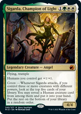 Humans will have to find strength in numbers to survive the Midnight Hunt, and alongside them for the fight is the angel Sigarrda, Champion of the Light and the Coven mechanic. This new Sigarda card shows that Coven is activated if you control three or more creatures with different powers. In this case, Sigarda searches the top five cards of your library for a human card to put in your hand whenever she attacks, and the Coven requirements are met.
