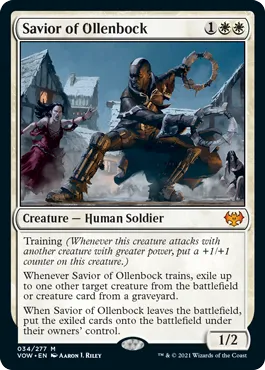Humans have an uphill battle to fight after losing daytime altogether on the plane and being overwhelmed by the horrors and monsters of Innistrad. The new keyword Training will surely help bolster their forces. Training’s rules text reads, “Whenever this creature attacks with another creature with greater power, put a +1/+1 counter on this creature.” It’s kind of like a reverse Mentor from 2018’s Guilds of Ravnica. Some creatures will also have an added benefit when they “train,” like Savior of Ollenbeck, which exiles a creature from the battlefield or graveyard whenever the effect triggers.