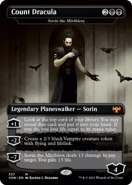 2020’s Ikoria: Lair of Behemoths marked the very first time alternate named cards with art from a non-Magic property were printed with Godzilla characters. With Crimson Vow, Wizards is tapping into the most iconic vampire of all time, Dracula. These alternate art, alternately-named cards are functional copies of the in-universe Crimson Vow cards, only these feature the names and art of characters from Bram Stoker’s Dracula novel. Above, you can see the alternate version of Sorin, which is Dracula himself, and below is Sister of the Undead, the Dracula Series version of Olivia, Crimson Bride.