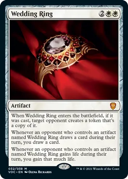 Commander decks for Crimson Vow will complete the set started in Midnight Hunt with two new 100 card premade decks featuring Vampires and Spirits, respectively. Also continuing from Midnight Hunt is the trend Wizards set in inserting Commander-focused cards in Set and Collector’s boosters that cannot be found anywhere else. These cards include Wedding Ring, a new white artifact that enables an additional card draw, an action typically lacking in that color.