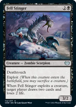 Making its way back to Magic from the Khans of Tarkir block is a simple but flavorful mechanic: Exploit. Cards with Exploit let the player sacrifice a creature they control for effects to occur. While the keyword costs a creature on your board to be consumed, you benefit from the effect detailed on the Exploit card, as well as letting you play into any sacrifice or graveyard synergies your deck may be built around. In the case of Fell Stinger, Exploit allows a target player to draw two cards and lose two life.